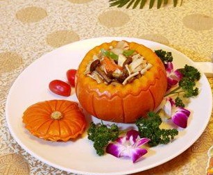4、把炒好的菇?少?汁倒入小番瓜盅中,多?的可放在旁?。吃的?候,可用小刀?小番瓜切?。好的小番瓜蒸熟後甜甜的、面面的。