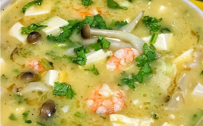 菜品一:菌菇鮮蝦蛋豆腐湯 食材:內(nèi)脂豆腐100克、海鮮菇50克、蝦仁10只、蟹味菇50克、雞蛋1顆。 做法: 1.鍋底放入少許油,